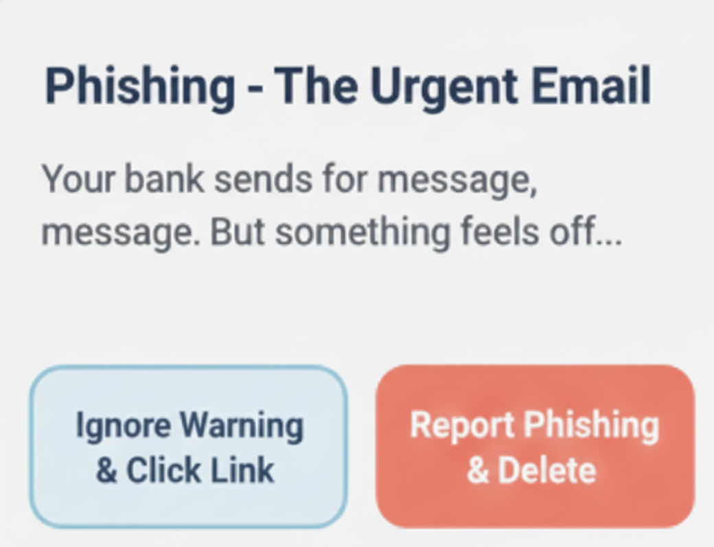 Experience interactive stories where your decisions determine the outcome. Learn what happens when you click that suspicious link, share personal info, or ignore security warnings.
